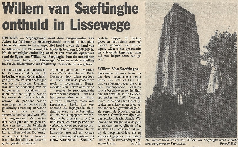 De eerste folders worden gedrukt en de eerste aktiviteiten worden op poten gezet. Zo is er een Willem van Saeftinghe stoet, diverse tentoonstellingen en de oprichting van het heemkundig museum. In 1987 krijgt Lissewege een standbeeld rond Willem van Saeftinghe op het marktplein en in 1989, ook op vraag van de VVV-Lissewege plaatst de stad Brugge een beiaard van 18 klokken in de toren.